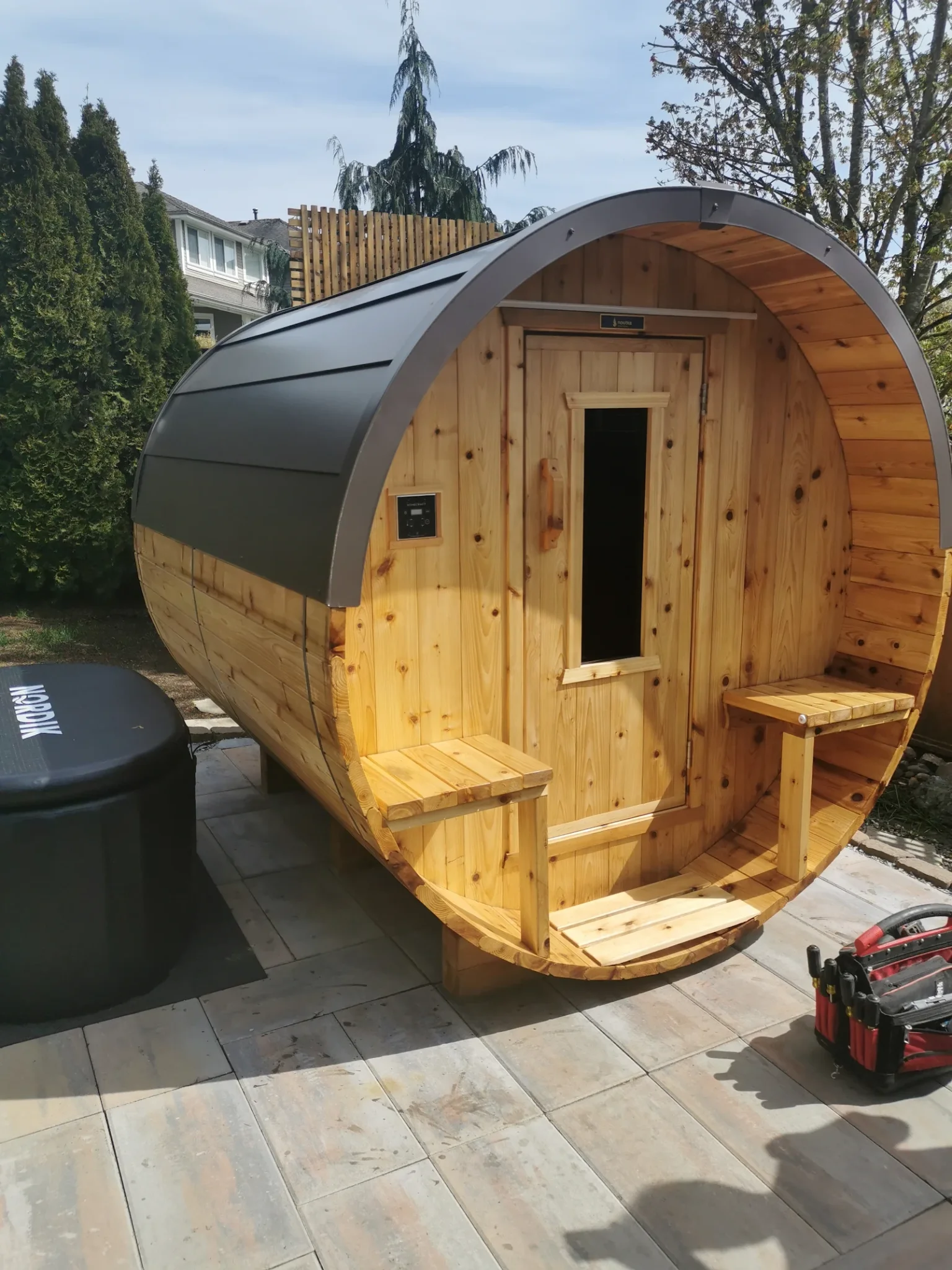 Full electrical hookup for a backyard barrel sauna — dedicated circuit, weatherproof outlet, and panel connection to get this outdoor retreat up and running safely.