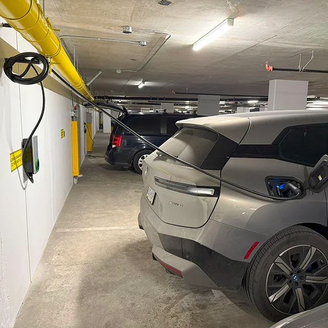Supplied and installed multiple Level 2 EV charging stations throughout an underground parkade, complete with dedicated circuits and conduit runs for a multi-unit residential building.