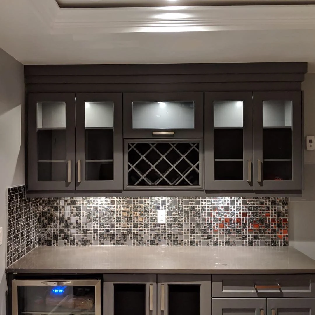 Installed recessed in-cabinet pot lights, under-cabinet LED strip lighting, and a dedicated outlet in the backsplash for a newly renovated home bar area.