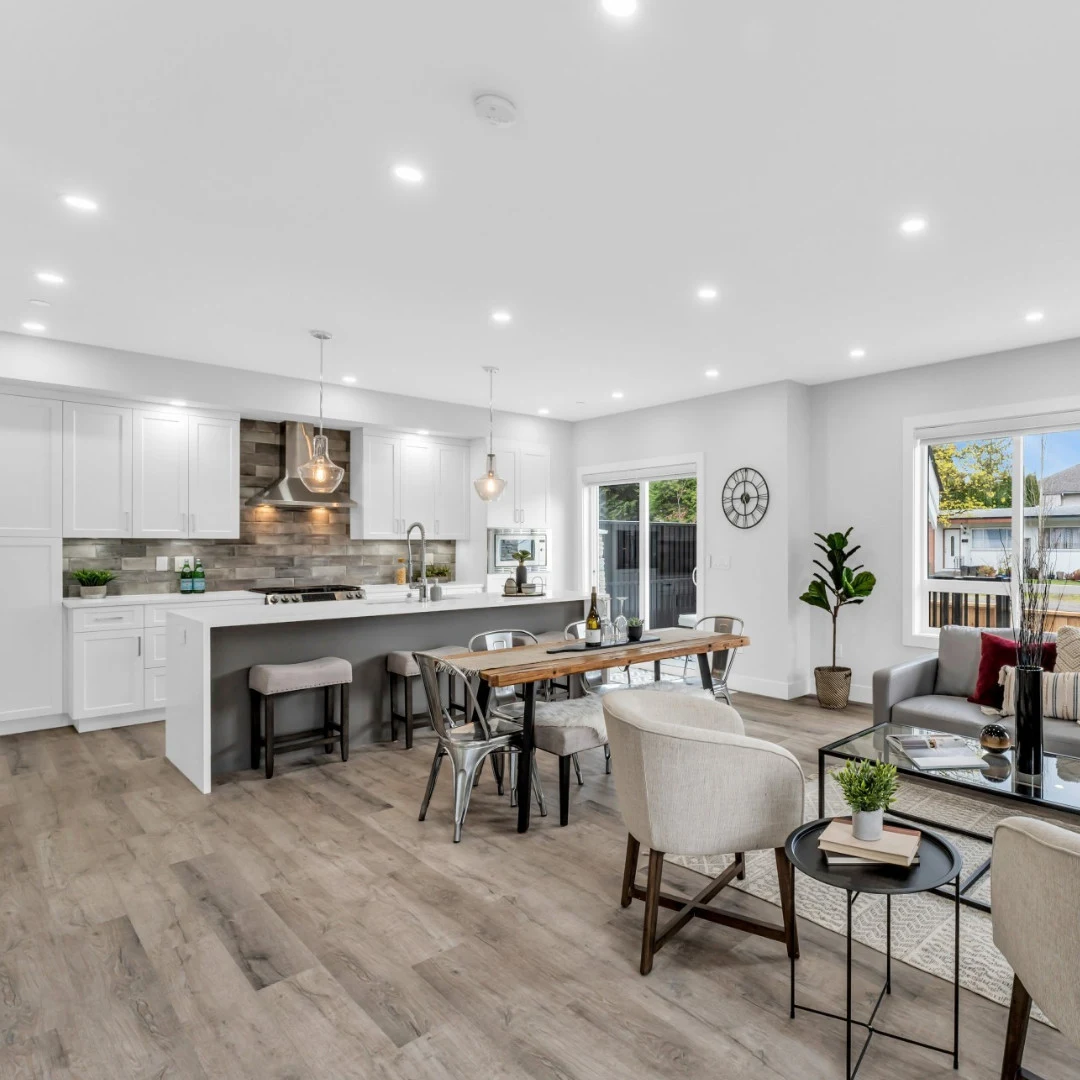 Full lighting package for a new open-concept home — recessed pot lights throughout, pendant lights over the kitchen island, and under-cabinet accent lighting.