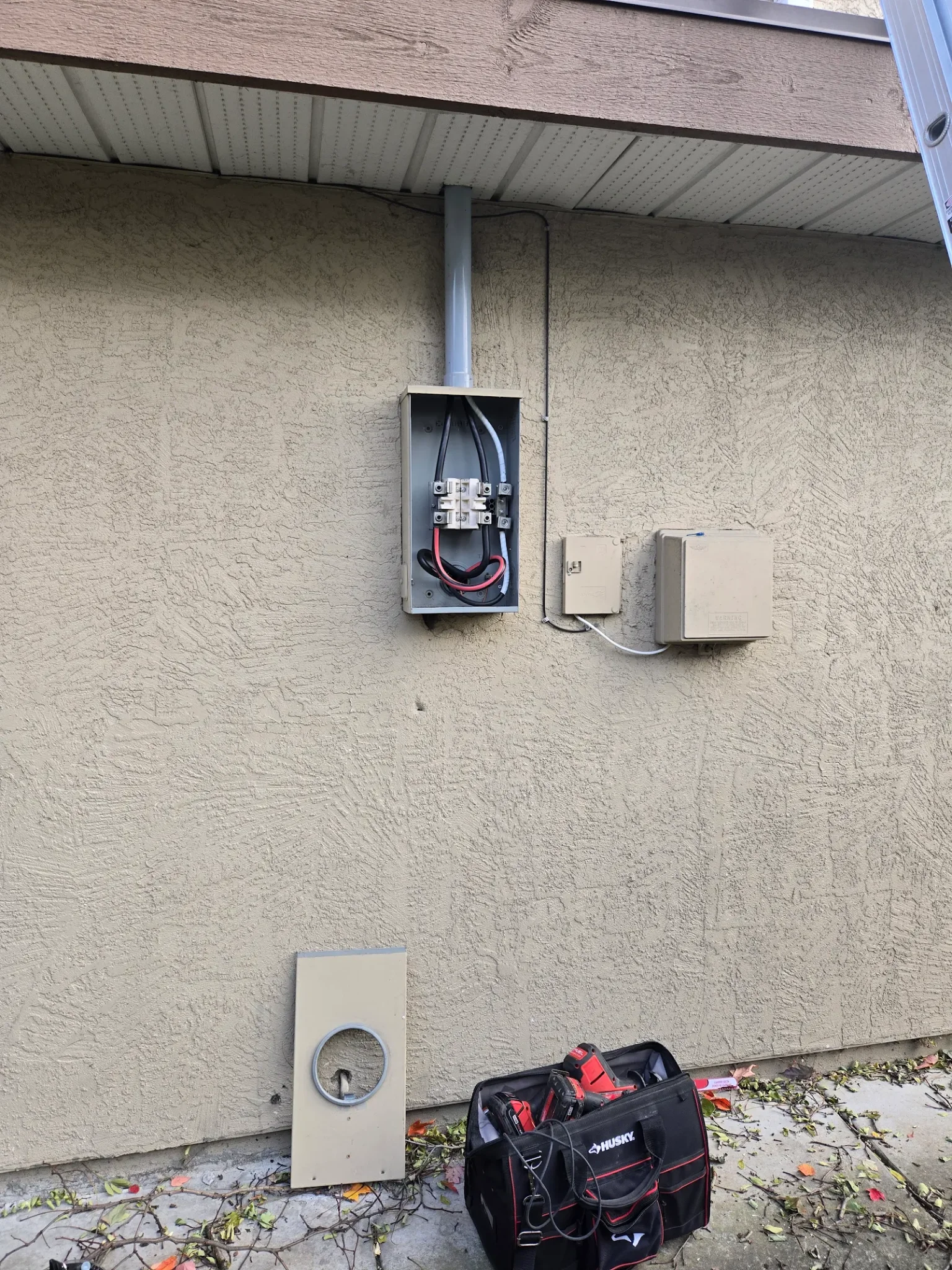 Installed an exterior meter base and sub-panel with conduit service entrance on a residential property, providing a dedicated power feed for a garage or outbuilding.